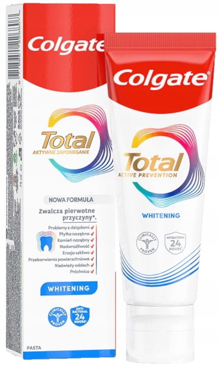 Colgate Total wybielanie to nowoczesny produkt pomagający utrzymać zęby i jamę ustną w zdrowiu, zapobiega nadmiernemu rozwojowi bakterii powodujących powstawanie próchnicy. Neutralizuje szkodliwy wpływ kwasów pochodzących z żywności co w efekcie zapobiega uszkodzeniom szkliwa i powstawaniu przebarwień oraz osadzaniu się płytki nazębnej. Wzmacnia, rewitalizuje oraz doskonale odświeża.